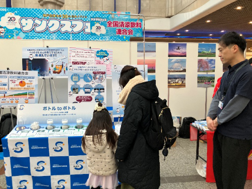 一般社団法人 全国清涼飲料連合会(会長:本庄大介、以下「全清飲」)は、関西エアポート株式会社(本社:大阪府泉佐野市泉州空港北1番地、代表取締役社長CEO:山谷佳之)と連携し、2月14、15日に「神戸空港開港20周年 サンクスフェス」、3月7日に「大阪国際空港 空の日エアポートフェスティバル」にて、ペットボトルの水平リサイクル啓発を行いました。サンクスフェスではPRステージへの登壇、PRブースの出展を行いました。空の日エアポートフェスティバルではブース出展でパネル展示、来場者の方にクイズにご回答いただき、ペットボトルの水平リサイクル「ボトルtoボトル」についてお伝えしました。