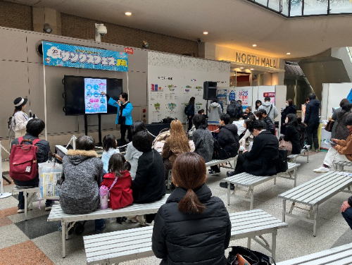 全清飲ブースでは、ペットボトルの水平リサイクルの取り組みに関する展示を行いました。また、リサイクルに関するクイズを用意し、回答いただいた方には関西エアポートよりご提供いただきましたプレゼントをお渡ししました。当日は、親子連れなど多くの来場者で賑わい、アンケートには約150名超の方にお答えをいただきました。