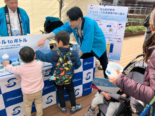PRステージでは、全清飲の活動説明、「ボトルtoボトル」の取り組みを説明しました。また、ブースでは、ペットボトルが水平リサイクルされるフローを模型化した展示物やペットボトルとボトルキャップをフレーク状に混在したものを水の入った水筒の中で比重分離する様子を確認するなど、お子様連れを中心に多くの来場者でにぎわいました。クイズにご回答いただいた方には、「なぜペットボトルを分別する必要があるのか理解できた」などのお声をいただきました。