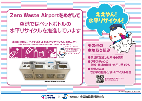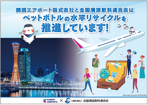 関西エアポート社は「Zero Waste Airport」を目指しており、ペットボトルの水平リサイクルに取組んでいます。大阪国際空港(伊丹空港)では、ペットボトルとキャップの回収ボックスを設置して分別回収を行い、回収したボトルの「ボトルtoボトル」を進めています。今回、両イベントにおいて、全清飲とともにペットボトルの分別回収の理解促進を進めることで、水平リサイクル率向上を目指していきます。